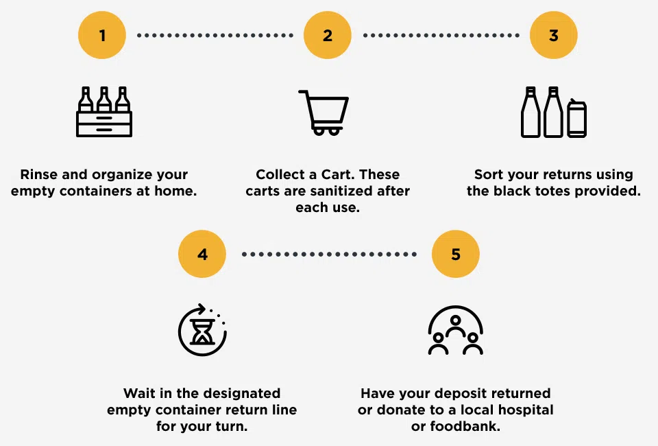 Bottles and cans need to be rinsed, sorted and placed in a sanitized shopping cart when you arrive at The Beer Store. There is a limit of one cart per person each visit and social distancing must be maintained while you wait in the designated return line. Customers have the option of donating their deposit to support the St. Thomas Elgin General Hospital or food banks in the community.