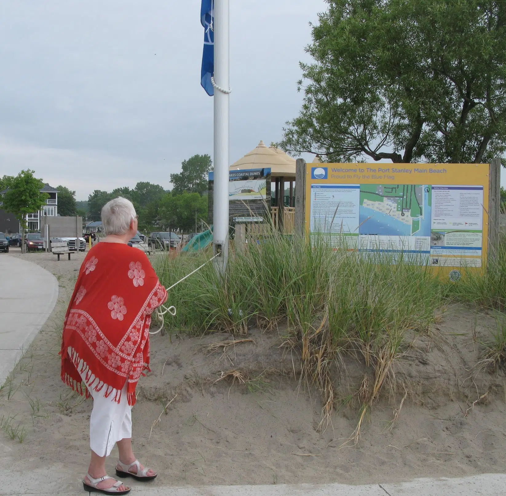 For the 11th consecutive summer, a Blue Flag will flutter over Port Stanley’s Main Beach. During a brief flag-raising ceremony this morning, Central Elgin Mayor Sally Martyn explained the significance of the world-renowned eco-certification.