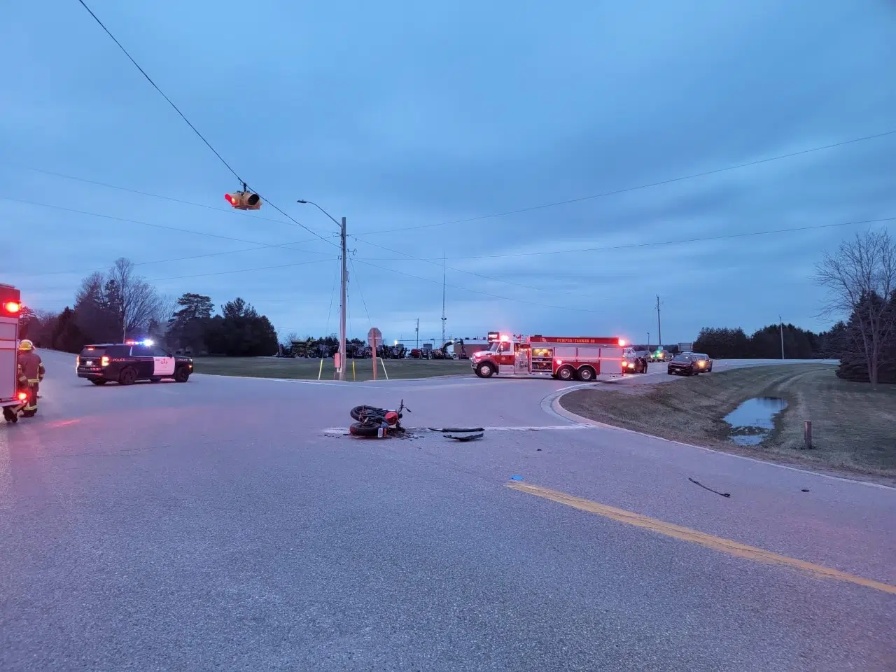 The collision involving an SUV and a motorcycle at the intersection of John Wise Line and Quaker Road, resulted in serious injuries to the motorcyclist.