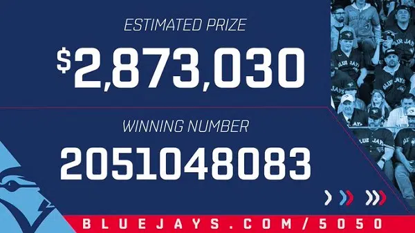 The winning numbers are 2051048083. Additionally, Jays Care notes that the winner purchased 250 tickets for $100 in-stadium on April 11 between 6-6:30pm.