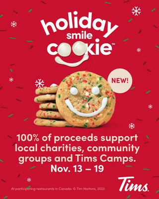 “We decided there’s no better time than the holiday season to continue this tradition in a new way and we’re excited that Holiday Smile Cookies will also support Tim Hortons Foundation Camps, which since 1974 has supported over 315,000 youth at its seven Tim’s Camps. We know our guests across Canada will be thrilled to help us support the spirit of kindness this holiday season” says Hope Bagozzi, Chief Marketing Officer at Tim Hortons.