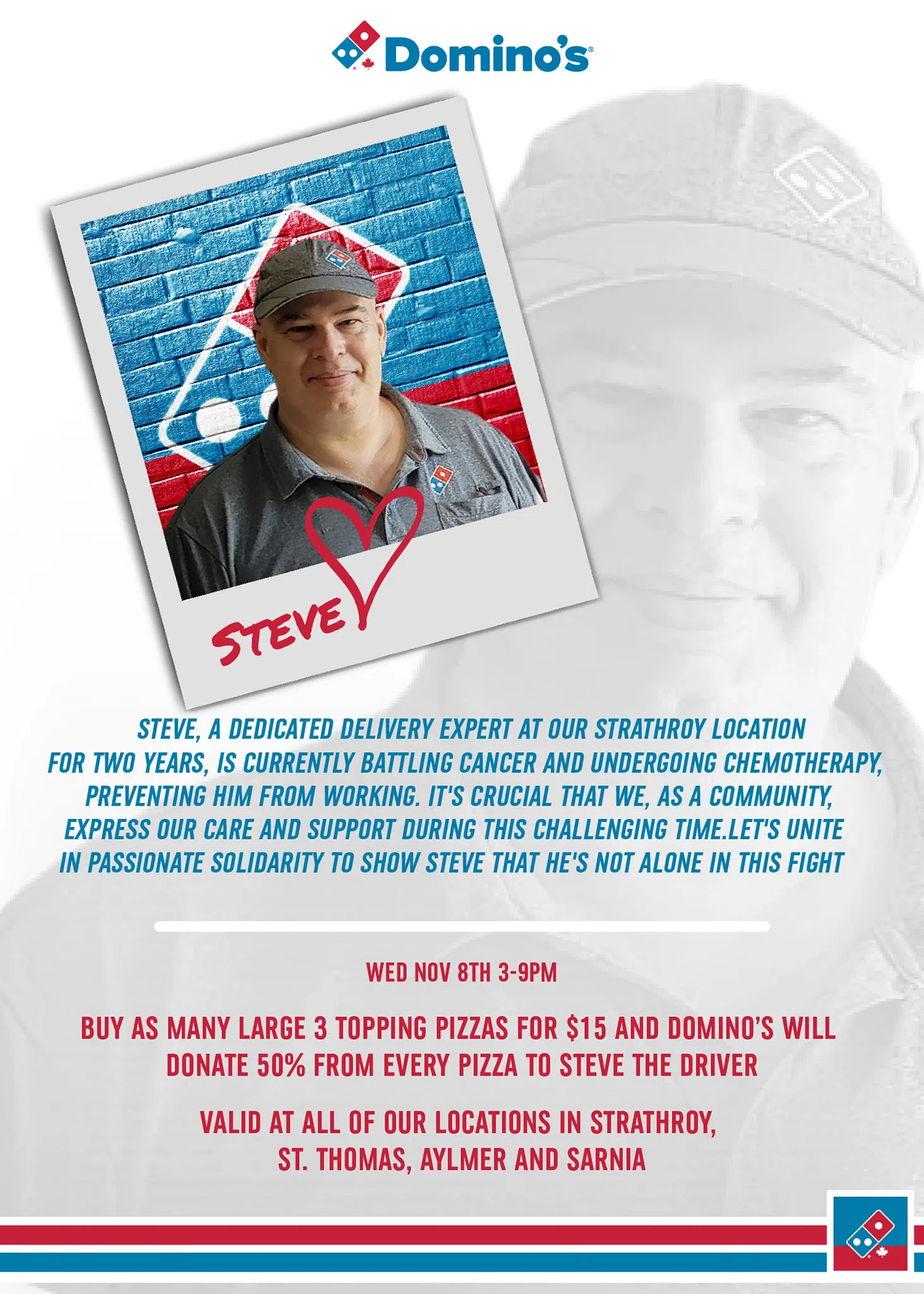 For orders made between 3 and 9 p.m., Dominos will donate 50 per cent from the sale of each large 3-topping pizzas to Steve.
