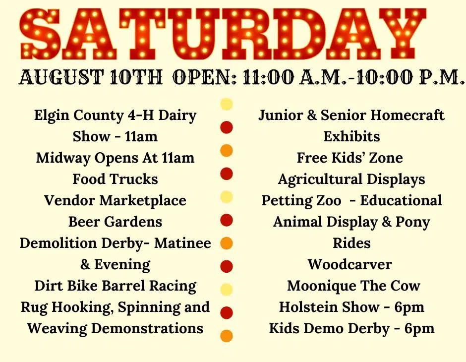 Running from August 9th to the 11th, the annual Aylmer Fair is back with all the fan favourites including the midway, petting zoo, cattle show, 4H competition and of course the demolition derby.