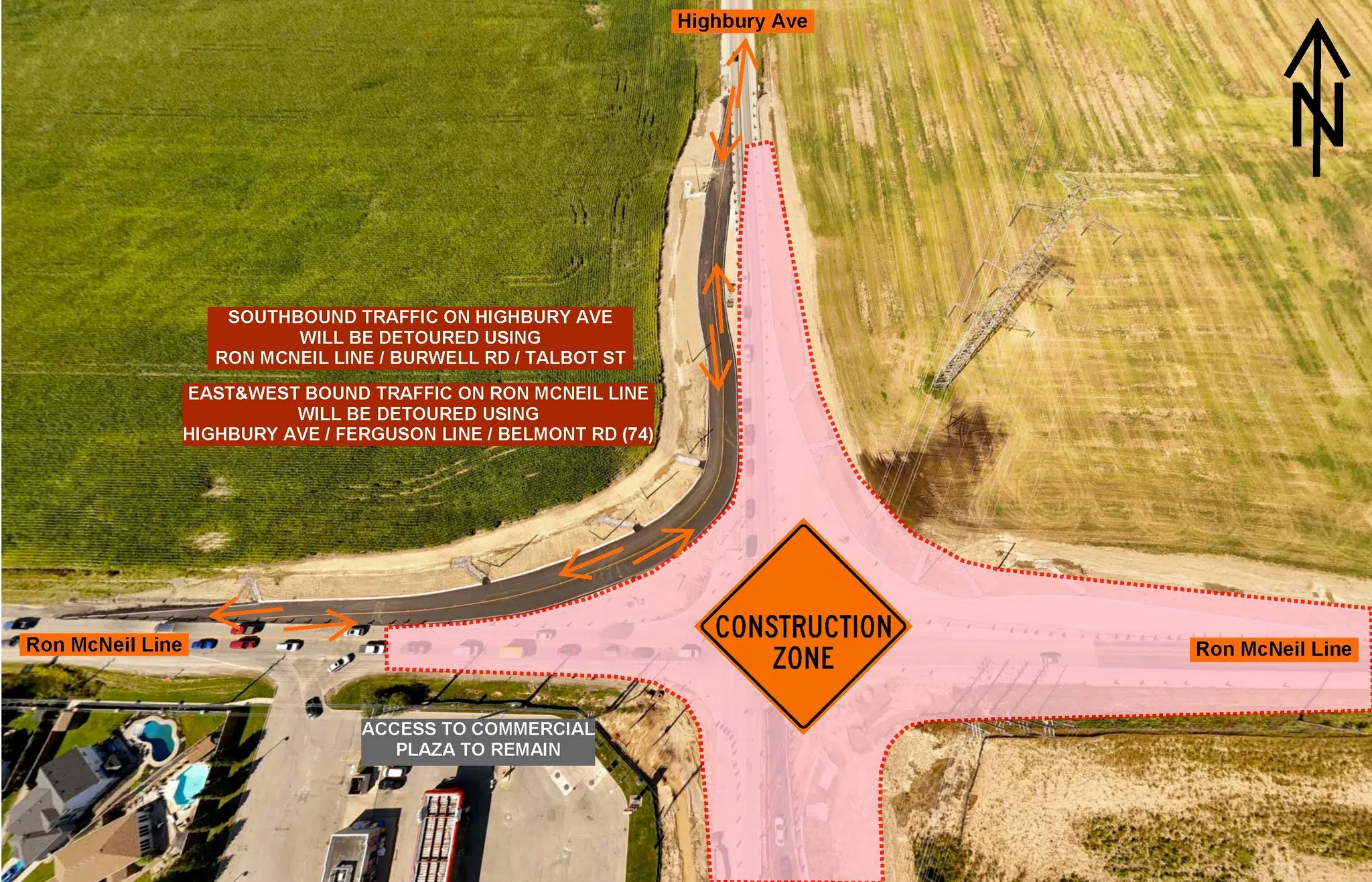 East/Westbound traffic on Ron McNeil Line will be detoured using Highbury Ave, Ferguson Line, and Belmont Road.