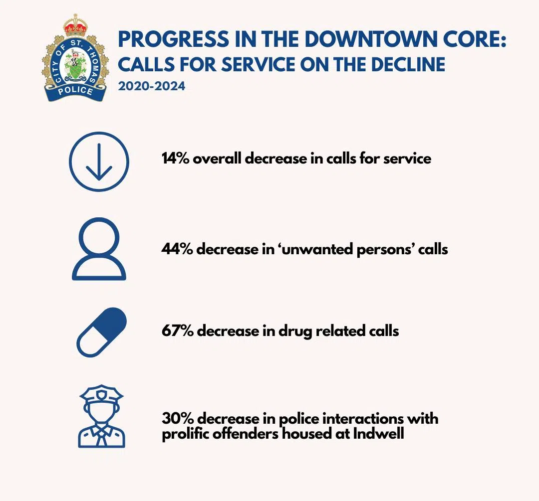 New data from the St. Thomas Police Service shows a marked drop in police calls in the city’s downtown core, pointing to the success of collaborative efforts between housing providers, support services, and police.