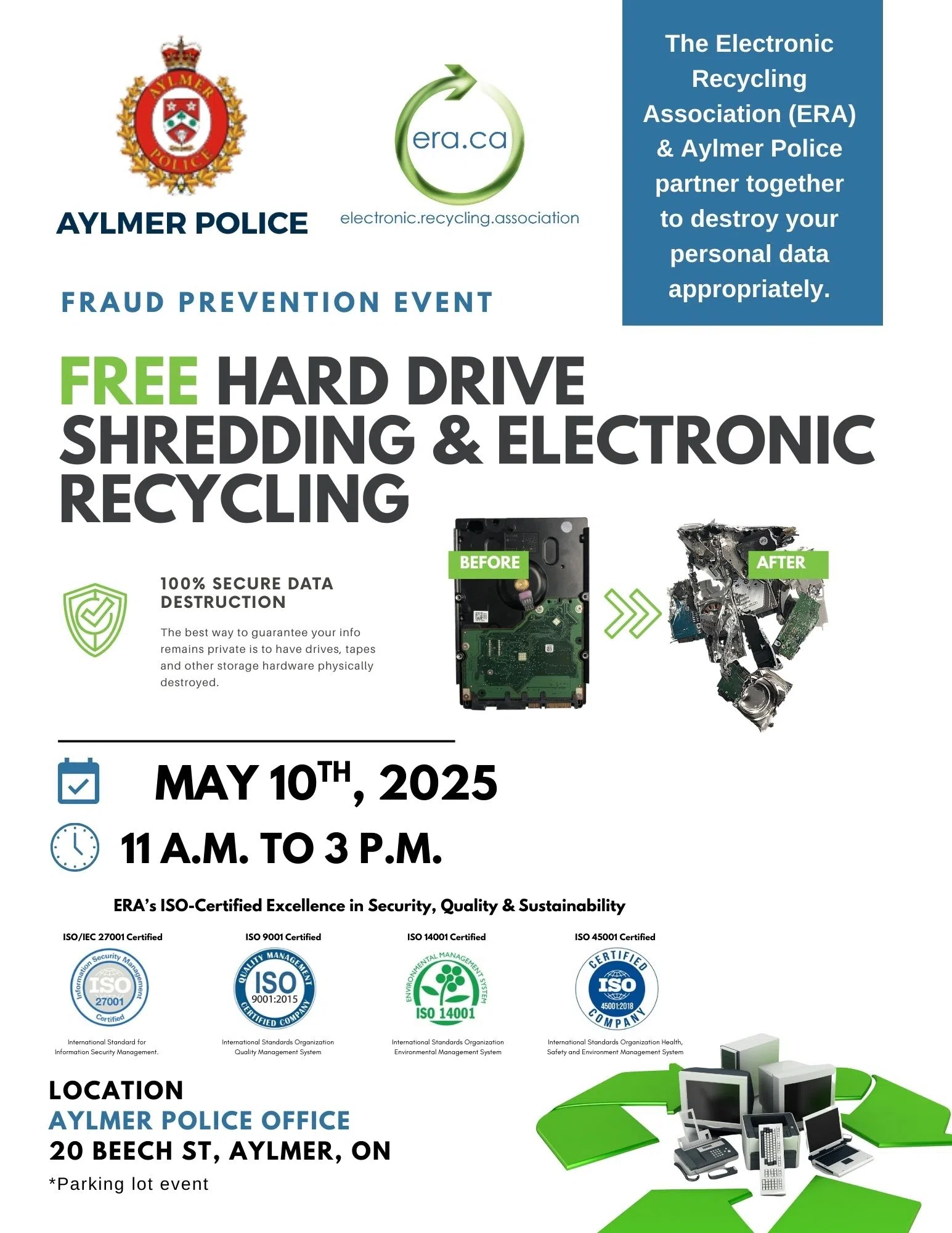 Running from 11 a.m. to 3 p.m. in the front parking lot of the Aylmer Police station at 20 Beech Street, the event is part of a fraud prevention initiative in partnership with the Electronic Recycling Association (ERA).