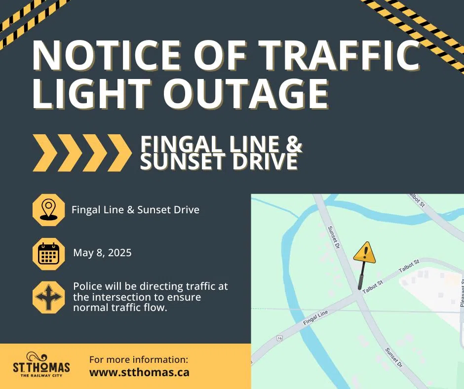 Drivers in St. Thomas should prepare for a temporary traffic light outage this Thursday, May 8, as city crews replace a traffic controller at the Fingal Line and Sunset Drive intersection.