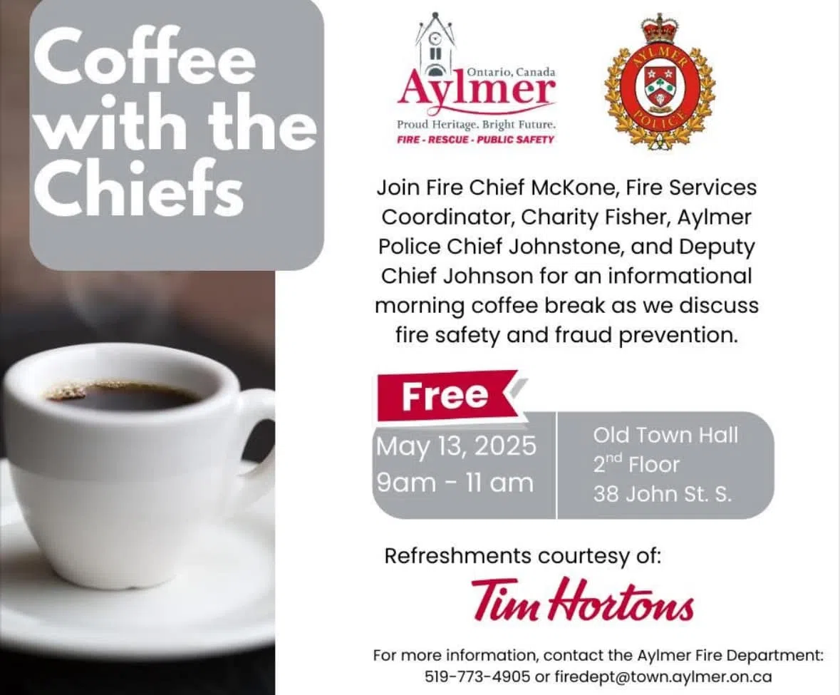 Community members will have a chance to enjoy a free cup of coffee and connect directly with local emergency leaders next week when “Coffee with the Chiefs” returns to Aylmer.