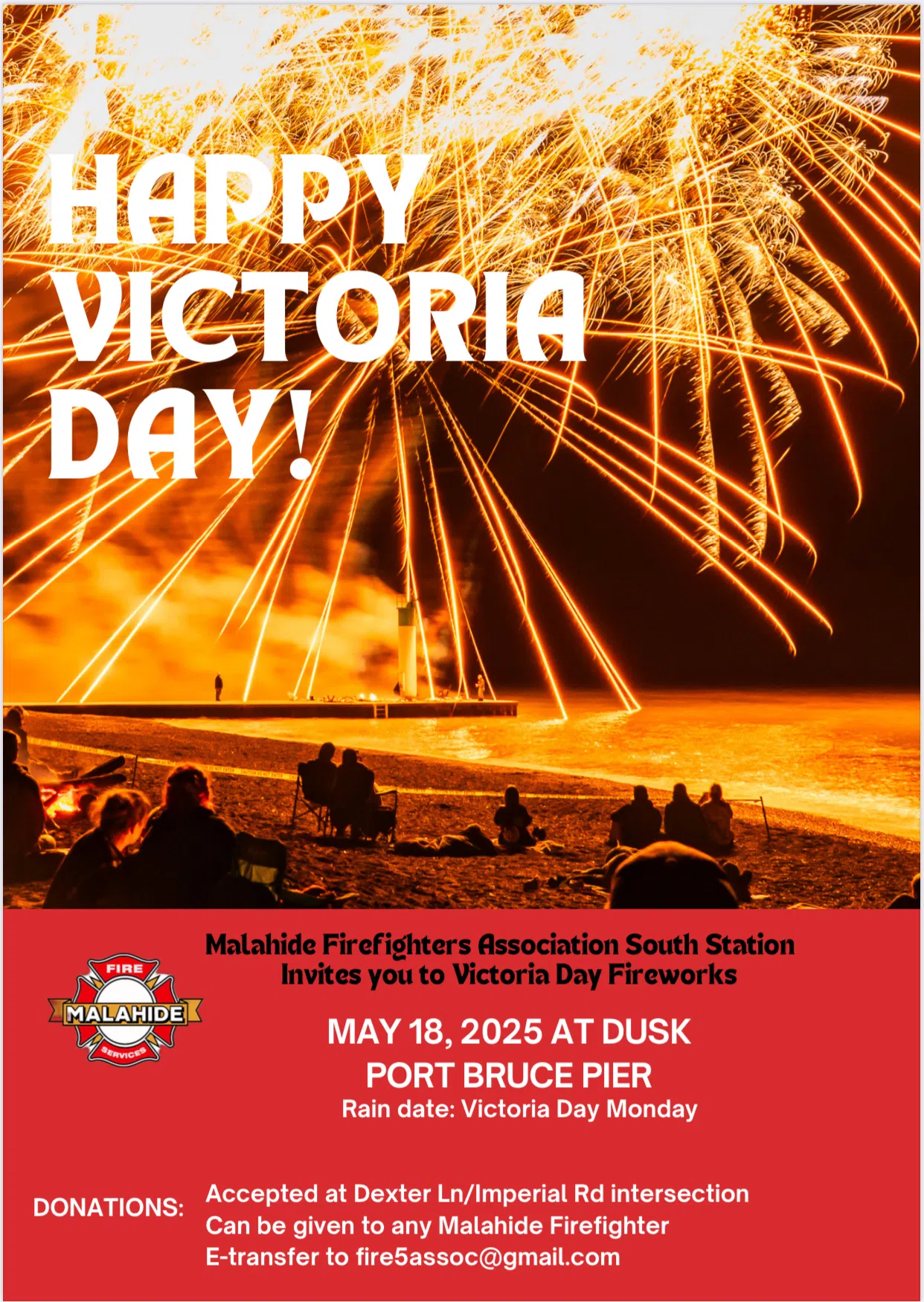 The Malahide Firefighter’s Association South Station is once again hosting its annual fireworks display on Sunday, May 18th, lighting up the skies from the Port Bruce Pier at dusk.