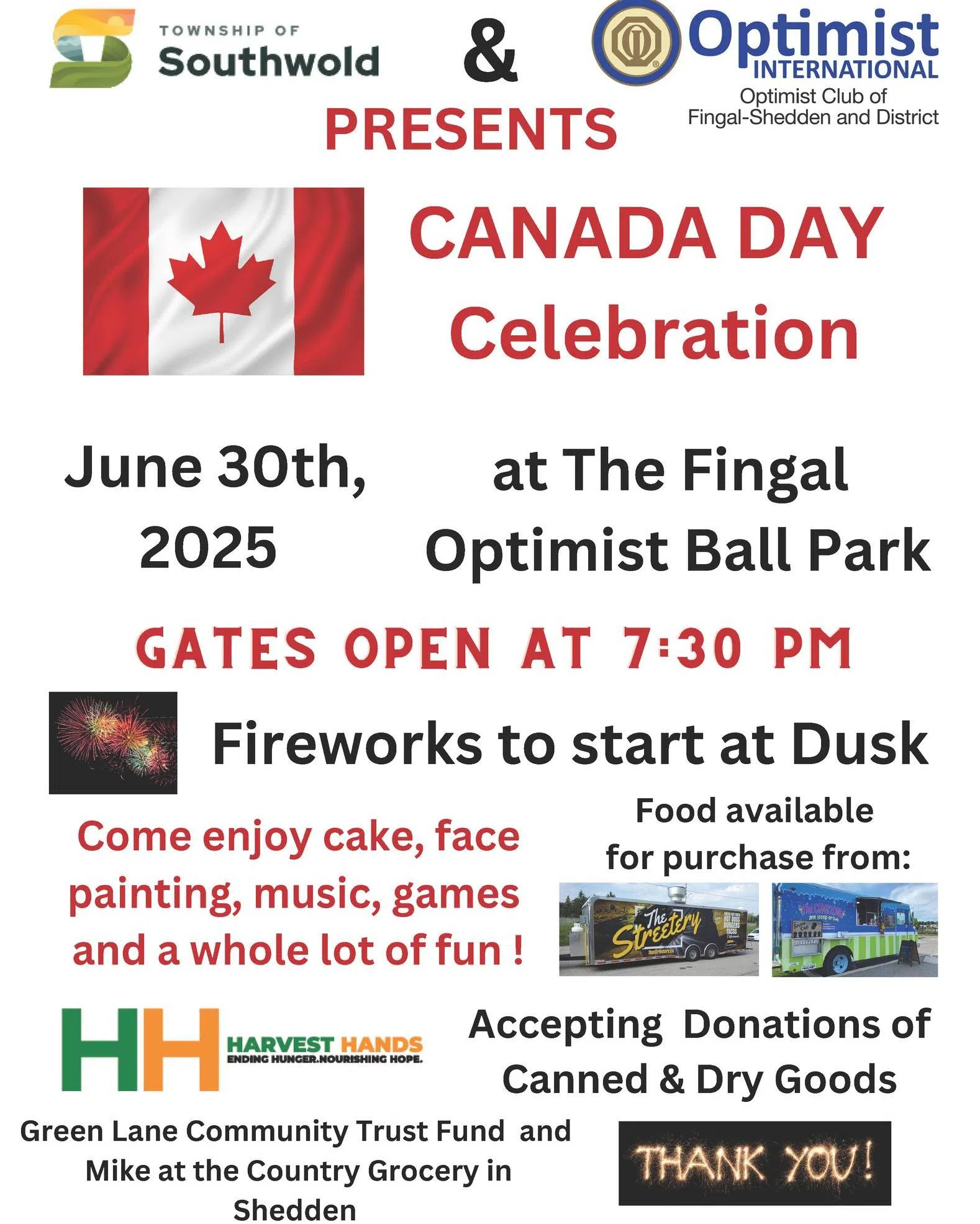 As is the case each year, the annual Canada Day celebration hosted by the Fingal-Shedden Optimist Club- takes place the night before on June 30th.