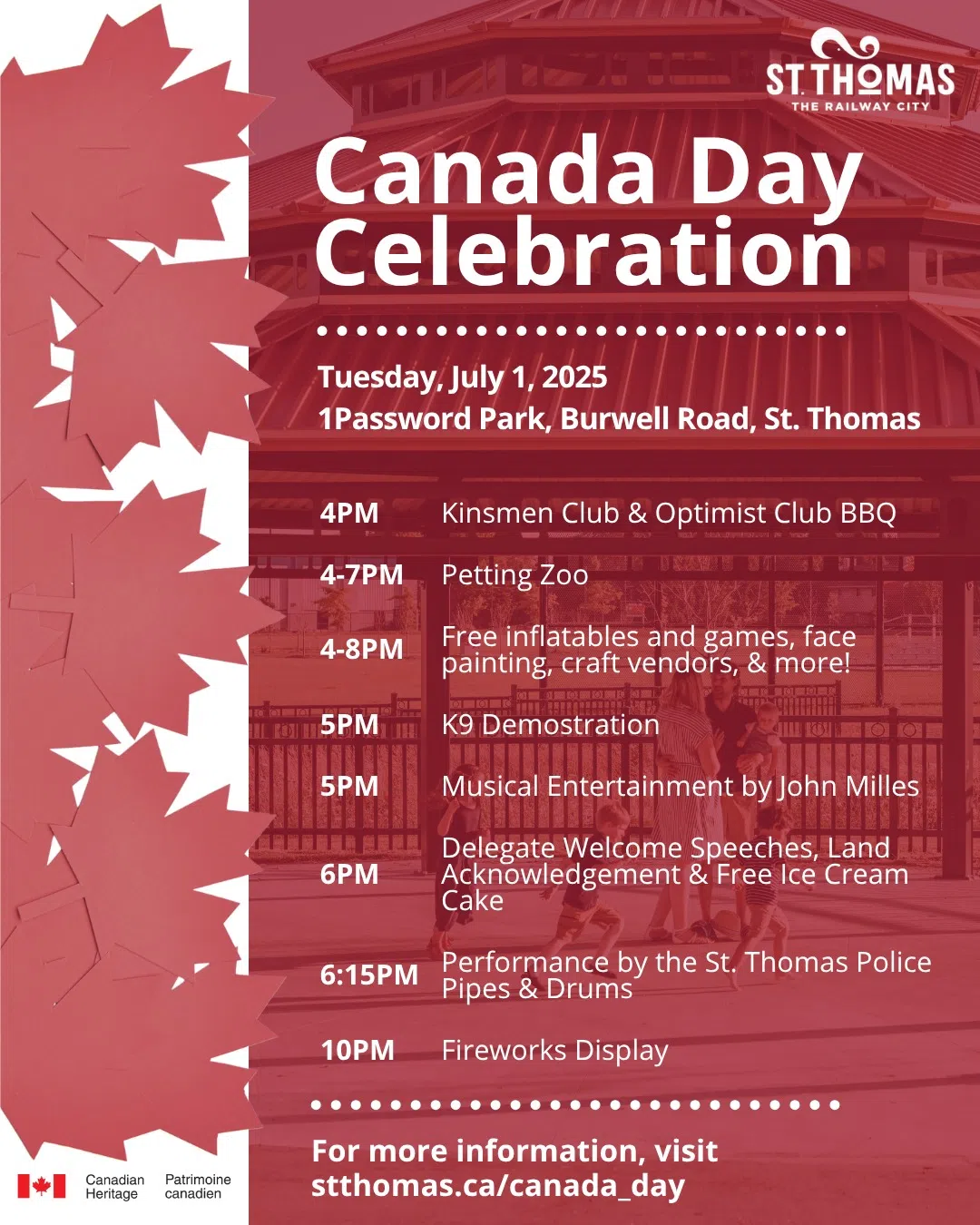 Festivities begin at 4 p.m. with family activities throughout the park, including inflatables, face painting, a petting zoo, and a wide variety of food options. Local service groups like the St. Thomas Kinsmen and the Optimist Club will be on-site with barbecue fare, while the splash pad and playground remain open for families to enjoy.