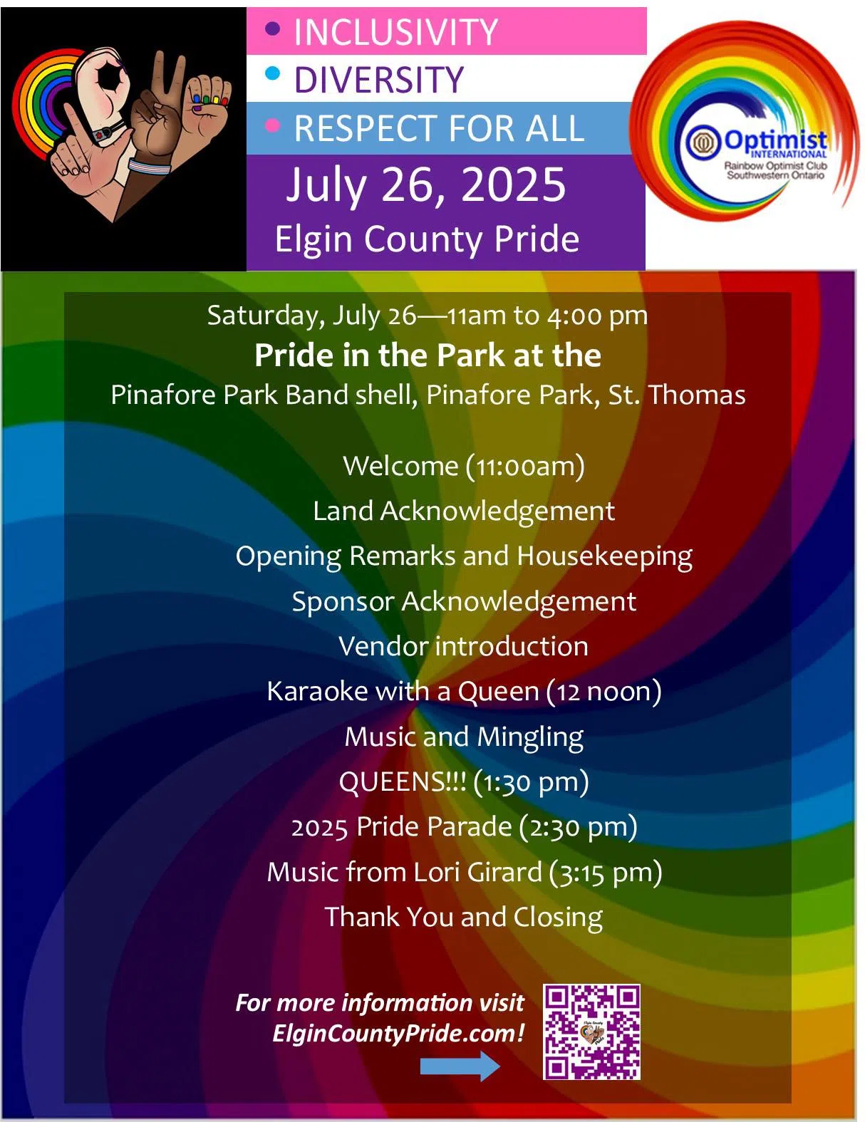 Elgin County Pride Week officially kicks off Friday, July 25th, with organizers from the Rainbow Optimist Club of Southwestern Ontario inviting residents to take part in a lineup of events designed to celebrate inclusivity, raise awareness, and foster local connections.