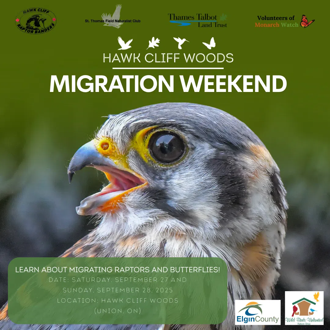The drop-in event runs from 10 a.m. to 3 p.m. on both Saturday, September 27, and Sunday, September 28, hosted by Thames Talbot Land Trust in partnership with the St. Thomas Field Naturalist Club, Hawk Cliff Raptor Banders, and volunteers with Monarch Watch.