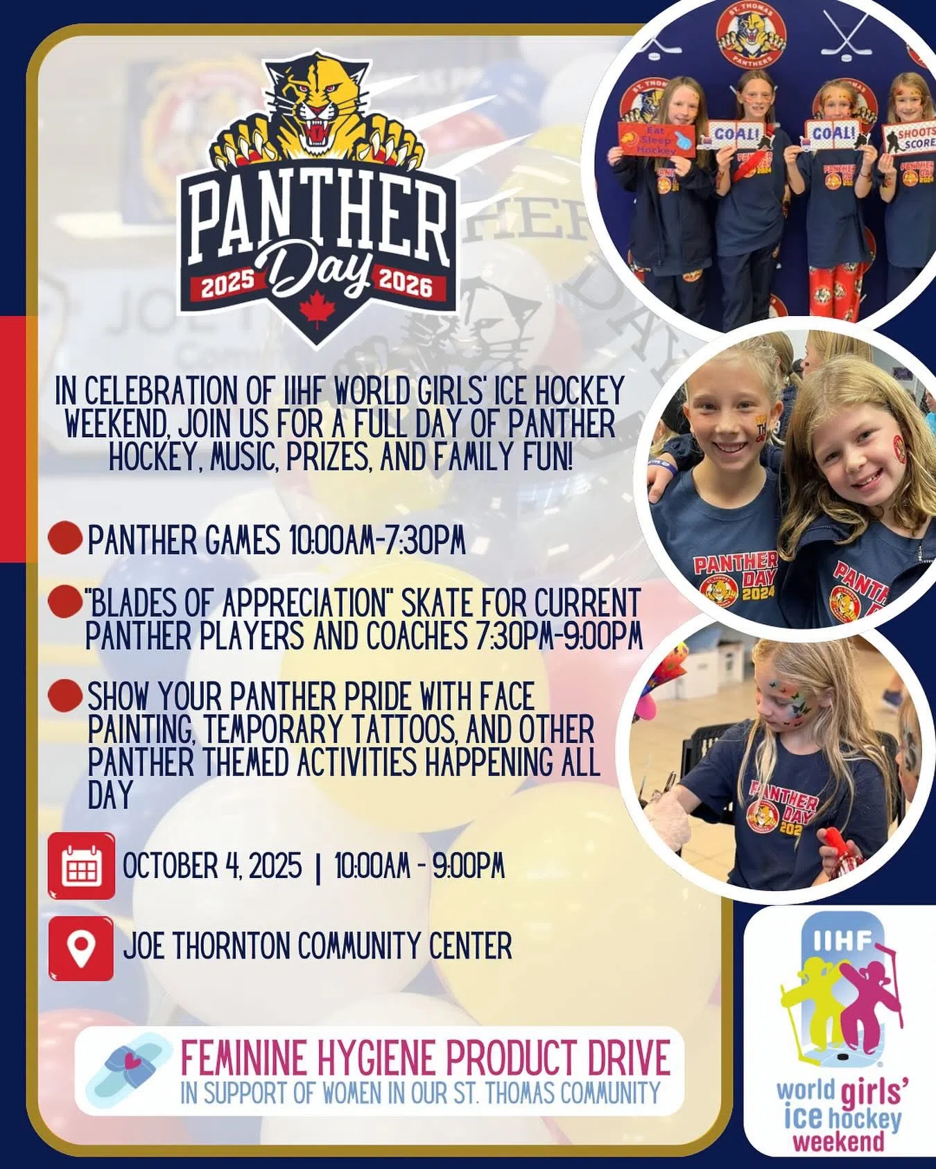 The St. Thomas Panthers Girls Hockey Association is inviting fans, families, and players to celebrate Panther Day 2025 this Saturday, October 4, at the Joe Thornton Community Centre.