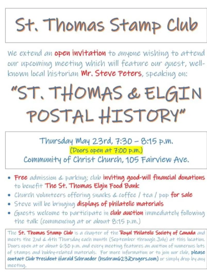The St. Thomas Stamp Club hosting guest speaker Steve Peters on "ST. THOMAS & ELGIN POSTAL HISTORY" on Thursday, May 23rd, with doors opening at 7 p.m.