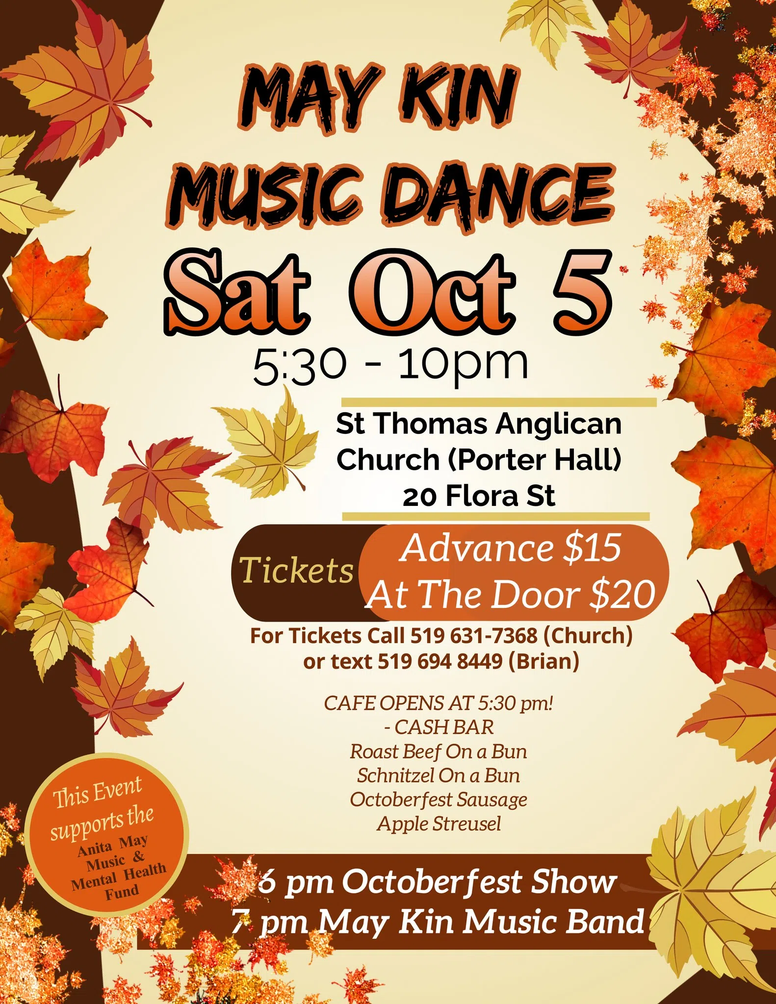 May Kin Music Dance goes Saturday, October 5th at St. Thomas Anglican Church. Tickets are $15.00 in advance or $20.00 @ the door. Come out for 5:30 & enjoy dinner at the cafe, music begins @ 6 p.m., cash bar. This event supports the Anita May Music & Mental Health Fund.