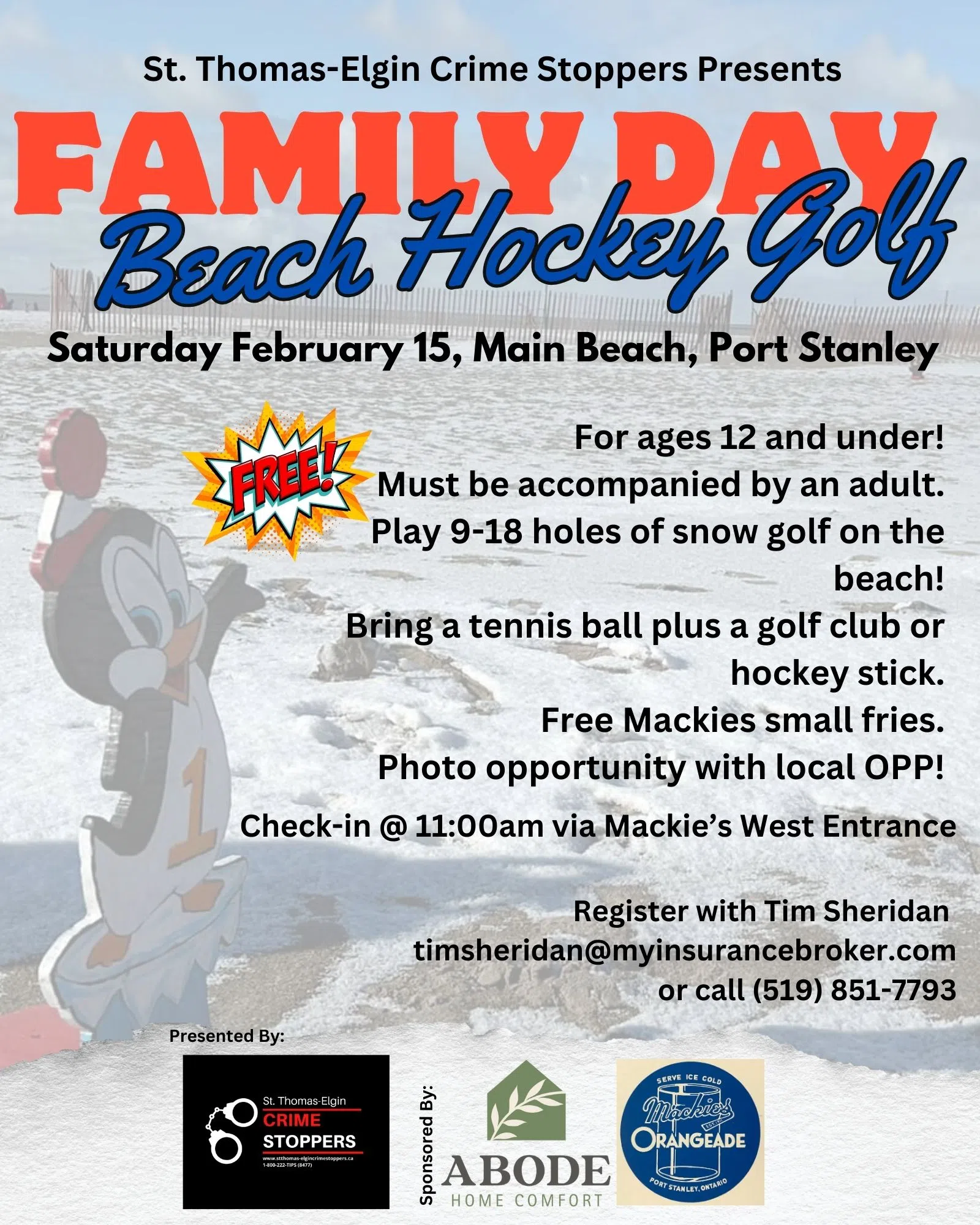 Free for kids 12 & under with an adult. Bring a tennis ball with a golf club or hockey stick and play 9-18 holes on the beach with free small fry. Sponsored by St Thomas-Elgin CrimeStoppers, Abode Home Comfort, & Mackie's