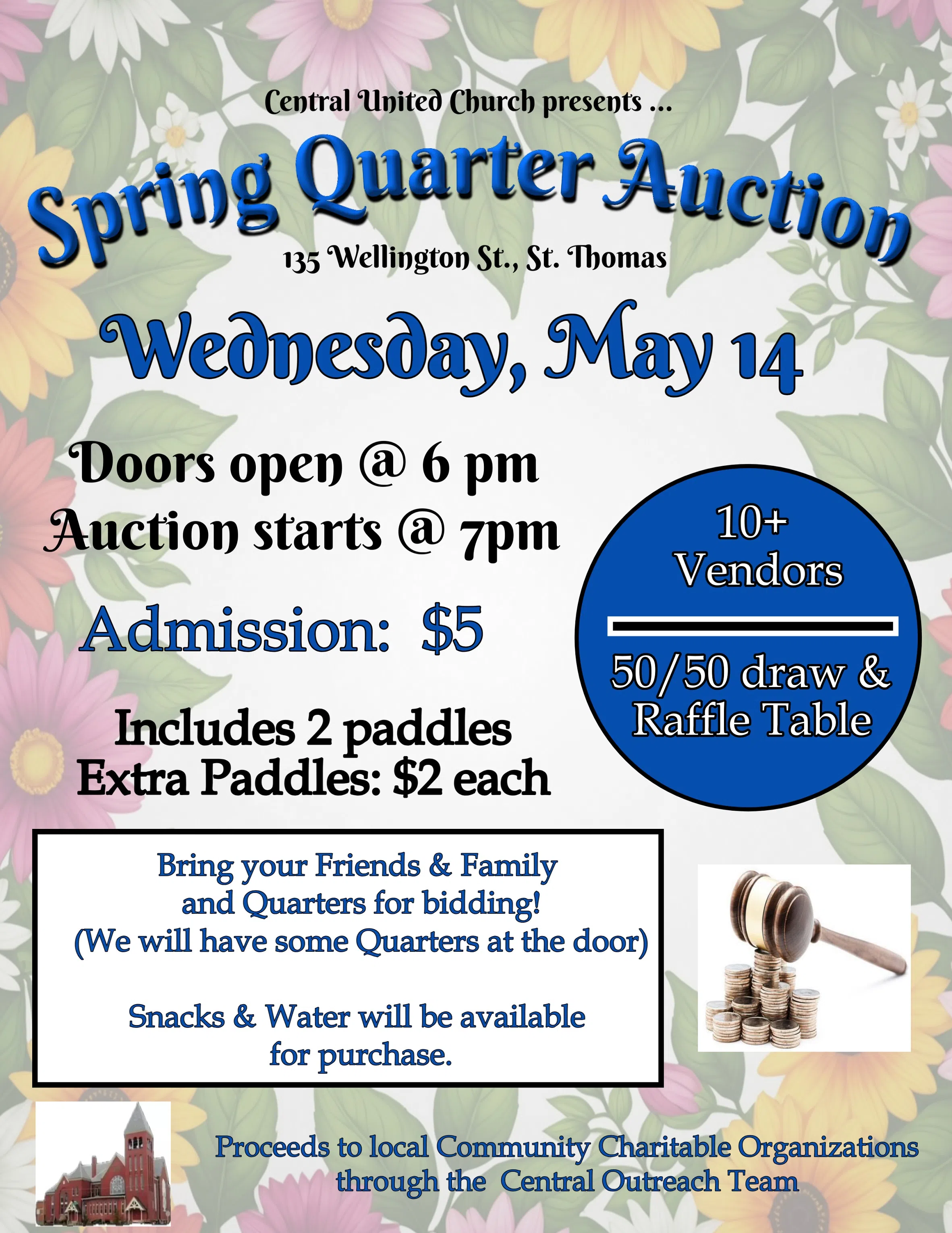 Spring Quarter Auction at Central United Church 135 Wellington Street in St Thomas Wednesday, May 14th Doors open at 6pm Auction starts at 7pm 10+ vendors 50/50 draw & Raffle Admission is $5 for two paddles. All welcome!