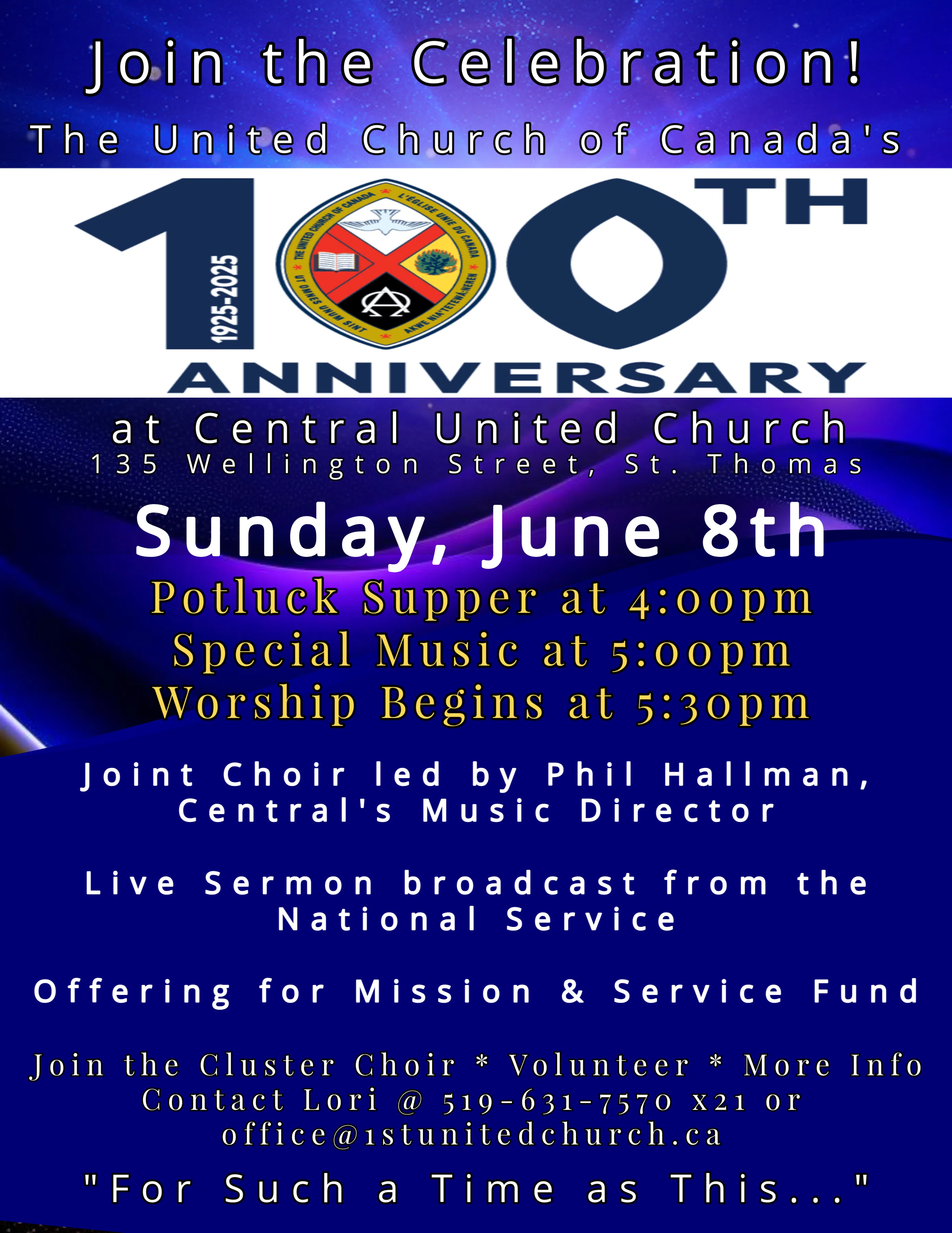 Join us at Central United Church (135 Wellington St., St. Thomas) on June 8th to celebrate the United Church of Canada's 100th Anniversary. Special Music from 5-5:30pm Worship Service begins at 5:30pm. The Sermon will be live streamed in from the National Service being held in St. John's Newfoundland. All welcome! RSVP to office@1stunitedchurch.ca