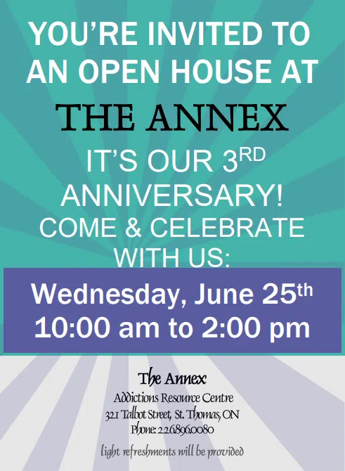 The Annex 3rd Anniversary Open House is being hosted on June 25th from 10 a.m. to 2 p.m. Light refreshments will be provided.