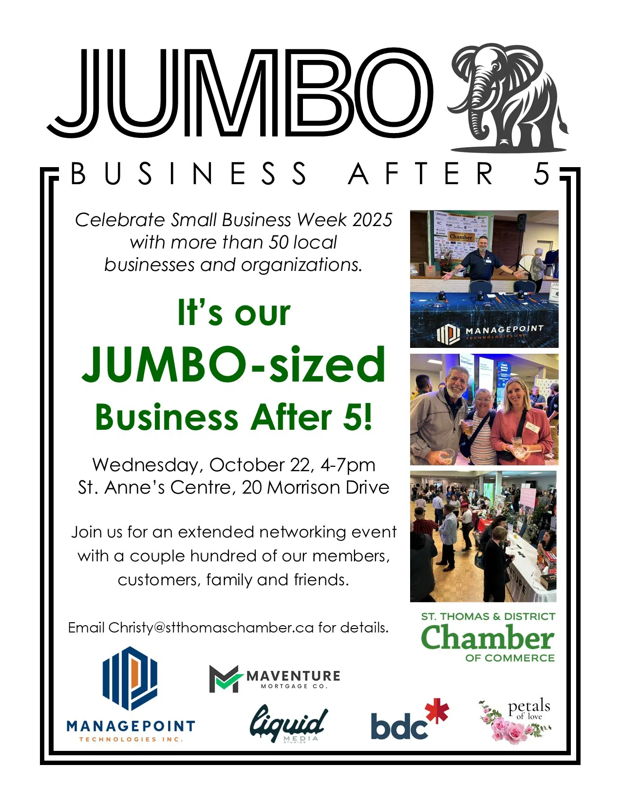 It's a jumbo-sized Business After 5! In celebration of Small Business Week, our monthly Business After 5 networking event is open to the public. No registration required. Come and check out more than 50 local business vendors. Buy something or just make new connections.