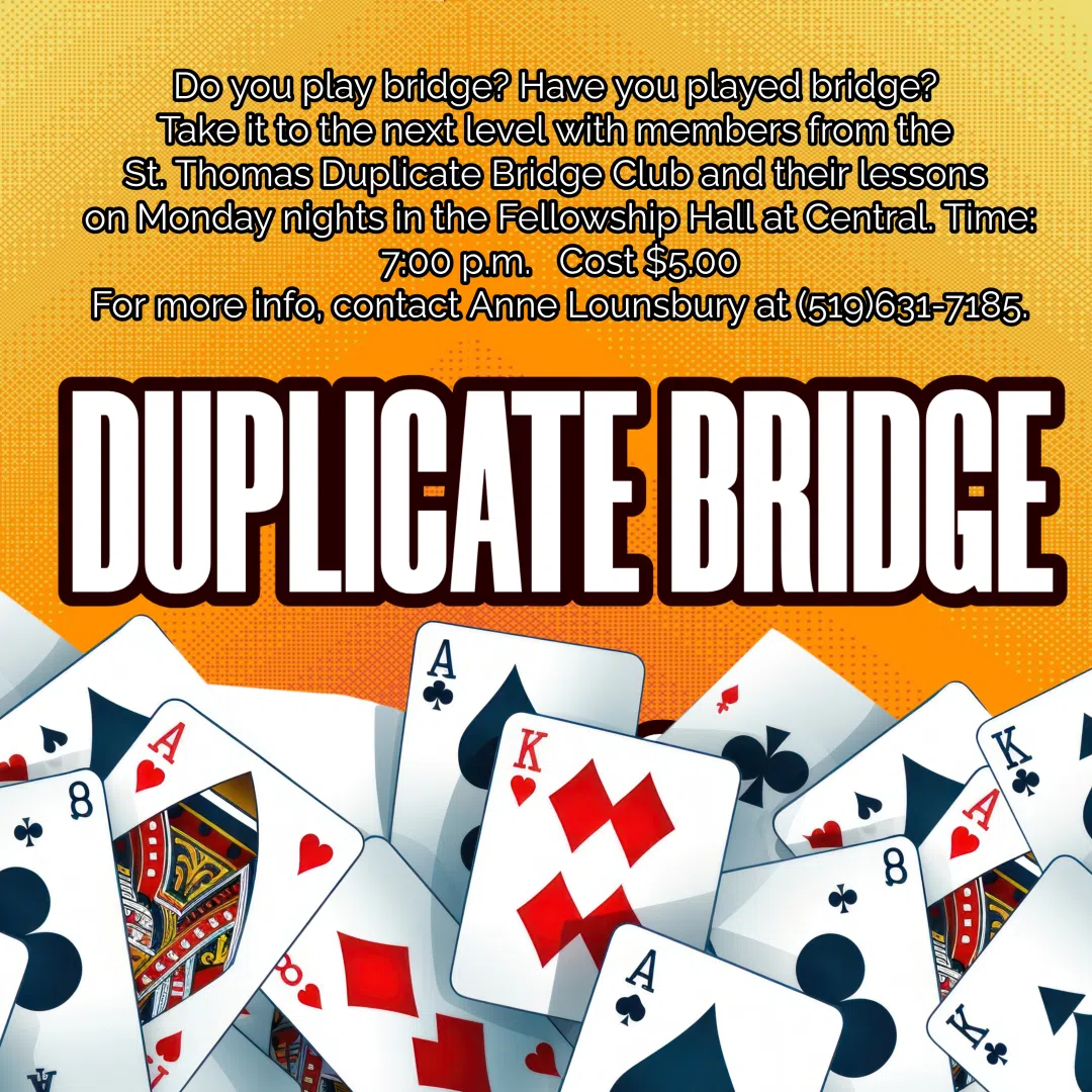 Duplicate Bridge - Do you play Bridge? Would you like to learn? Join members of the St. Thomas Duplicate Bridge Club for lessons on Monday evenings at 7pm at Central United Church (135 Wellington St., St. Thomas) Cost $5.00. For more info, contact Anne Lounsbury at 519-631-7185.