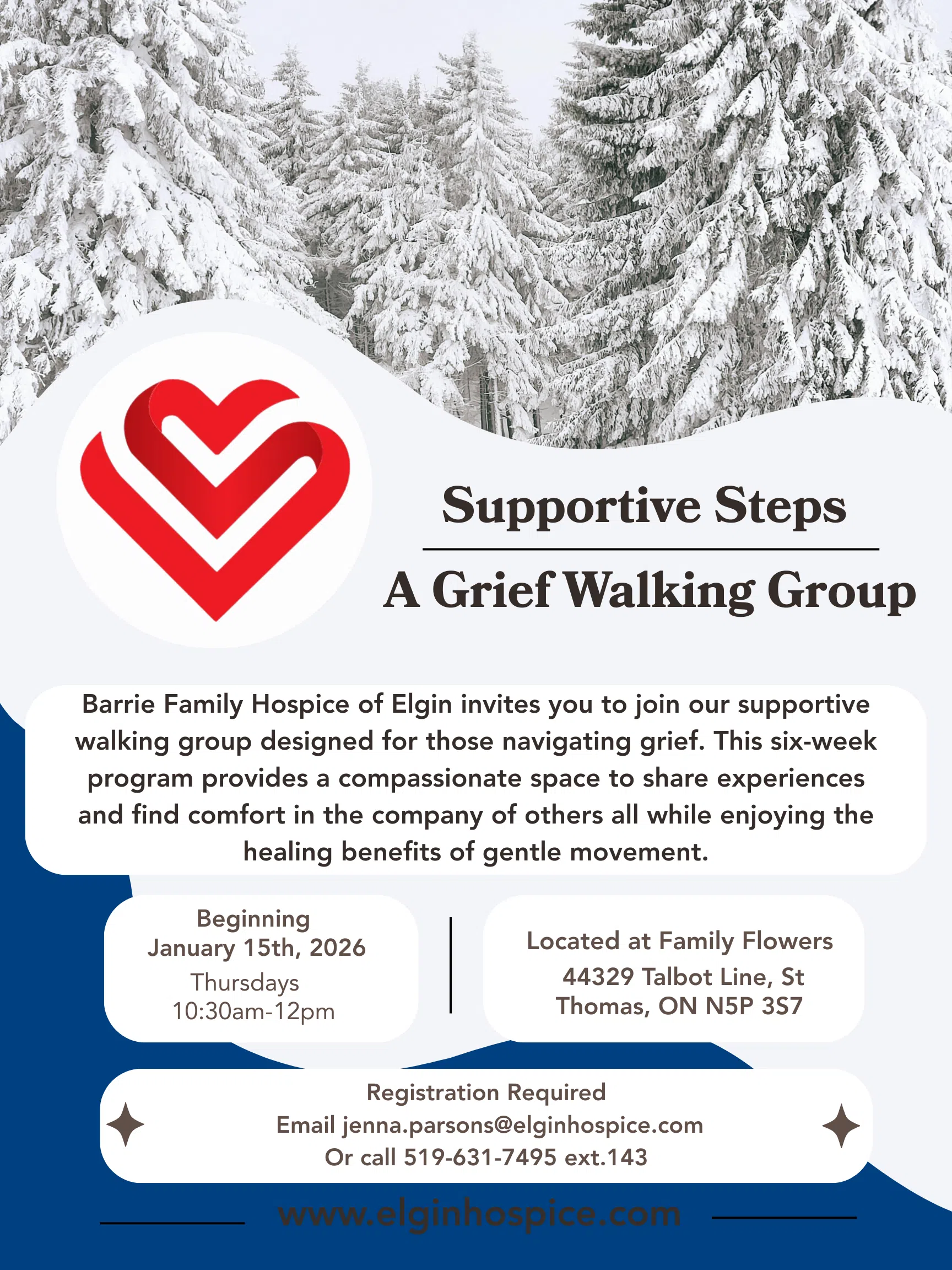 Barrie Family Hospice of Elgin will be hosting a supportive walking group for adults navigating grief. This six-week program offers a compassionate space to share experiences, connect with others, and benefit from the healing effects of gentle movement. Sessions will take place on Thursdays from 10:30 a.m. to 12:00 p.m. Registration is required.